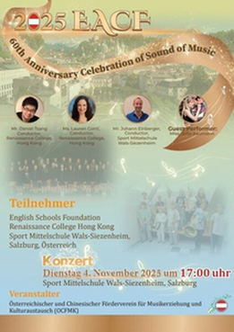 Ein besonderes Konzert steht am 4. November 2025 in der Sportmittelschule auf dem Programm: Für das European Academic und Culture Festival (EACF) besucht eine Delegation des Renaissance College Hong Kong (eine Schule der English Schools Foundation ESF) die Sportmittelschule in Wals-Siezenheim - und gemeinsam mit Schülerinnen und Schüler unserer Schule wird es ein Jubiläumskonzert anlässlich von 60 Jahre "Sound of Music" geben.